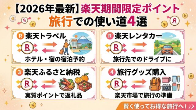 旅これ【2026年最新】楽天の期間限定ポイント 旅行での使い道4選|トラベル・レンタカー・ふるさと納税・旅行グッズ購入を徹底解説 2026年3月7日 すずめのぴんぴ https://www.travelphotolover.com/wp-content/uploads/2022/04/名称未設定のデザイン.png “Tabigraph タビグラフ”