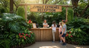 入園したら迷わず「ジャングル エクストリームズ レセプション」へ全員で直行しましょう。「お土産を見よう」「トイレに行こう」は後回しです。