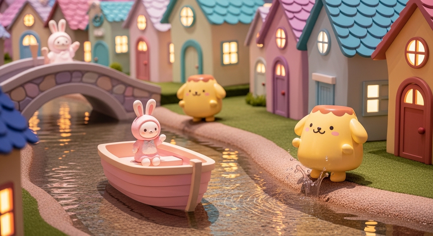 キティちゃんからのパーティー招待状を届けるため、ボートに乗ってサンリオの世界を巡ります。リニューアルで新しいキャラクターも仲間入りしています。